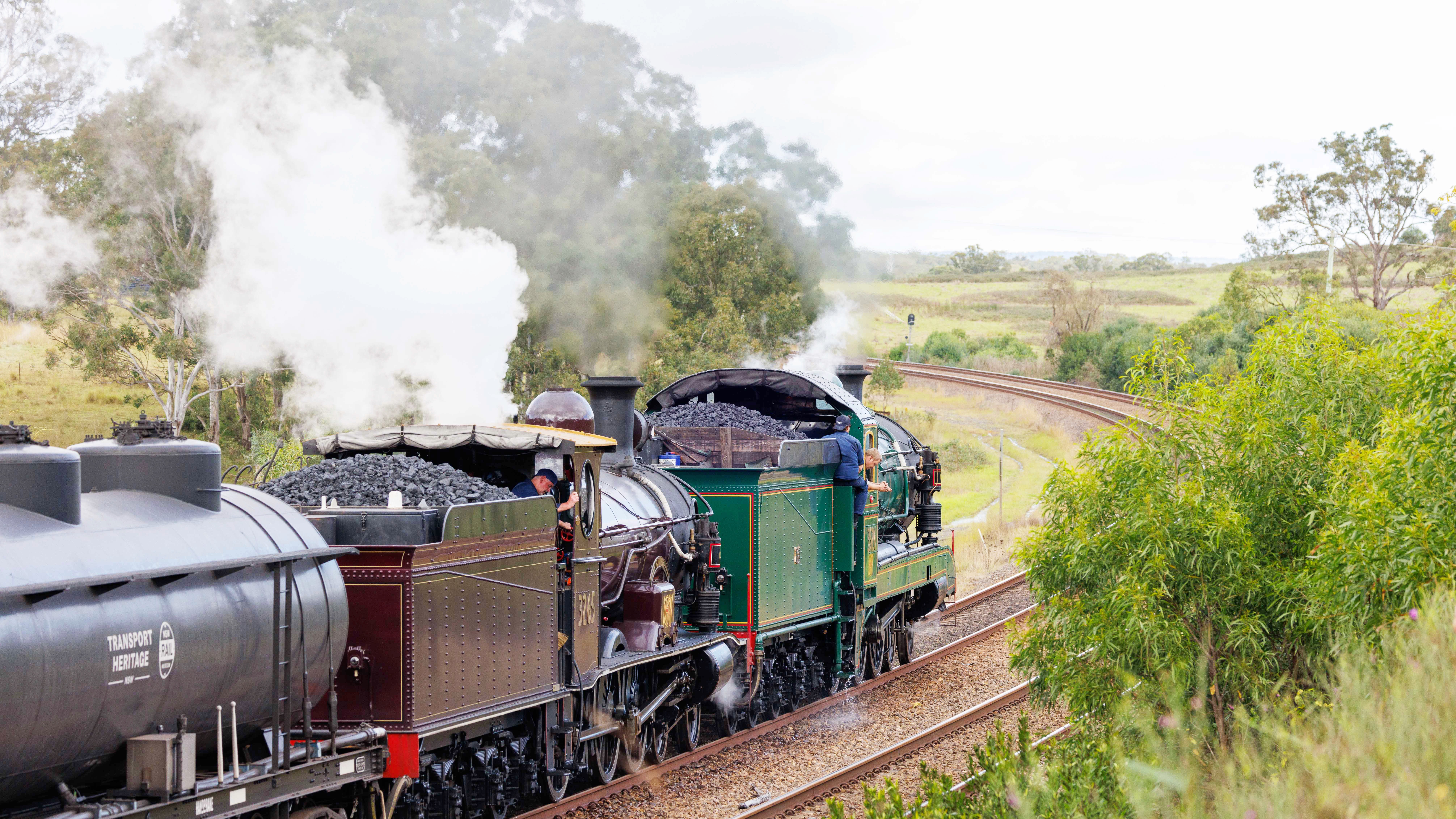 Your journey begins behind a vintage diesel locomotive from Sydney to Picton. There, iconic steam locomotives 3265 and 3526 will take the lead in double header, carrying you through the Highlands in authentic heritage style.