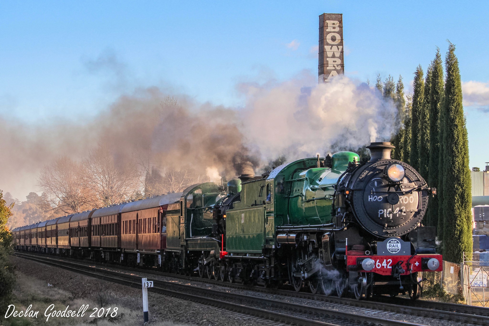The trip was diesel hauled from Sydney to Picton for a change of motive power from diesel to steam, where recently overhauled 3526 teamed up with 3642 and double-headed the service from Picton to Moss Vale. This trip would be 3642’s last mainline run before being taken out of active service and undergoing a major overhaul. With 3526 recently reactivated into service after its five-year overhaul, this was almost a symbolic passing of the baton between the two engines.