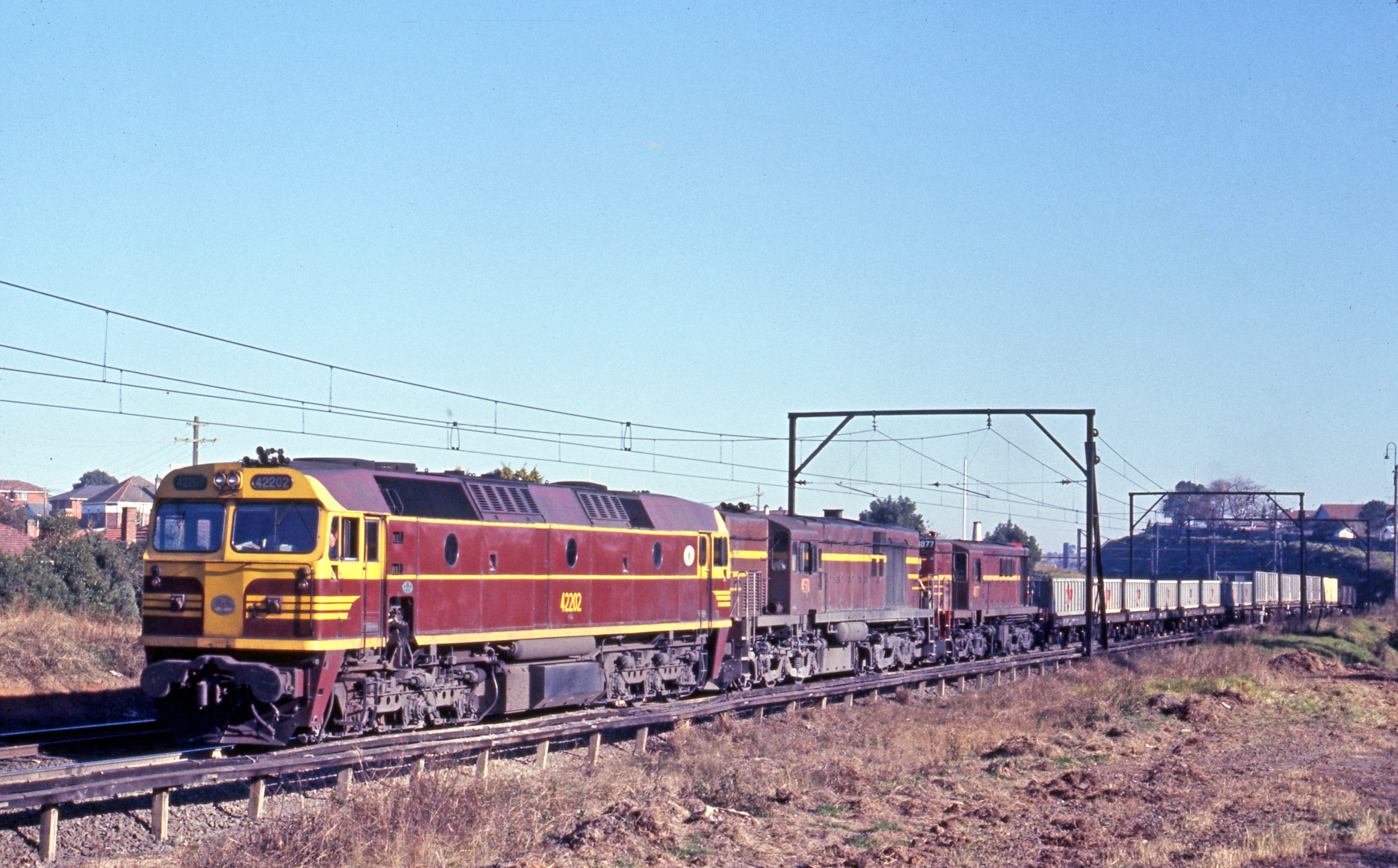 On 4 July 1971, 42202, 4501 and 4877 haul an up freight from Enfield through Belmore North on the way to Port Botany. -John Ward