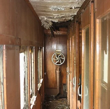 The passenger compartments were in a severe state of disrepair before the team started work on them. On the right is a completed compartment with new upholstery and photographs on the bulkhead.