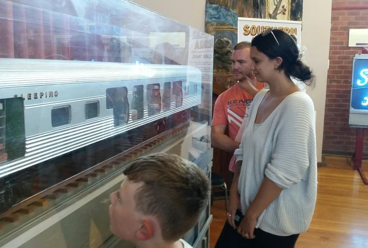 Visitors enjoy viewing the sectioned large-scale model of the Southern Aurora sleeping car on display at the Violet Town Community Complex. Chris Fielder