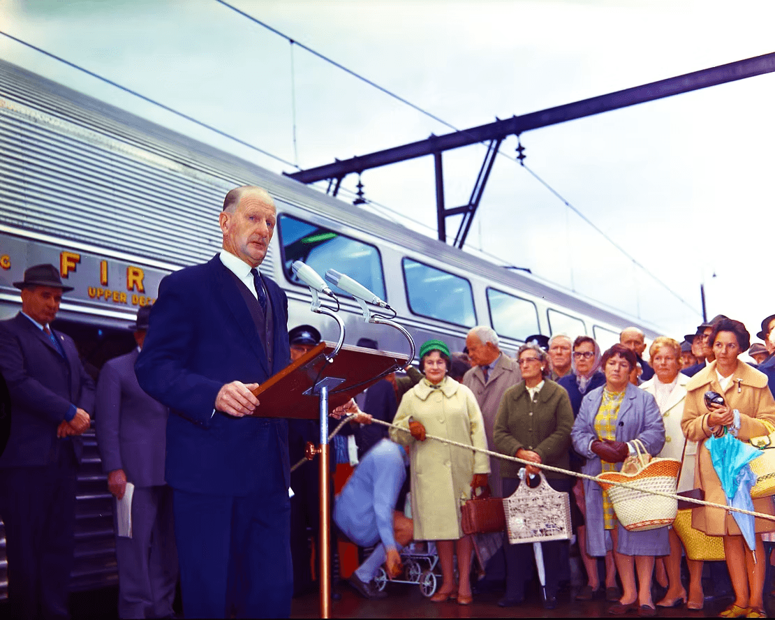 NSWGR Commissioner Neal McCusker hands over the new interurban double decker trains for service at Gosford, June 1970. NSW State Archives