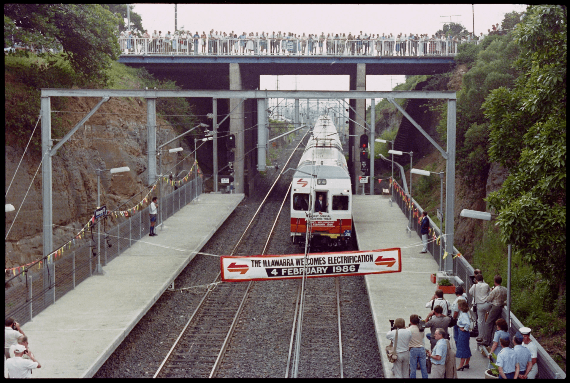 Set V28 forms the inaugural electric service to Wollongong, February 1986. NSW State Archives